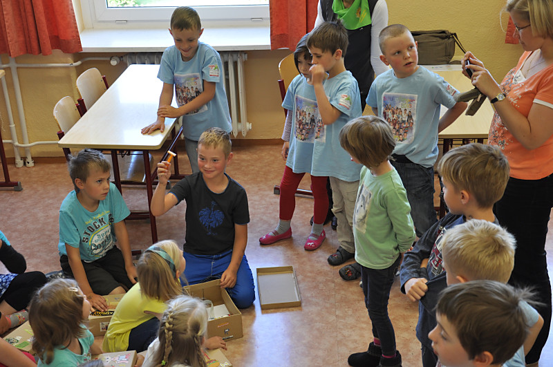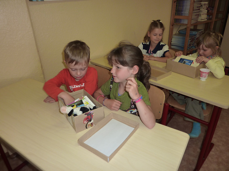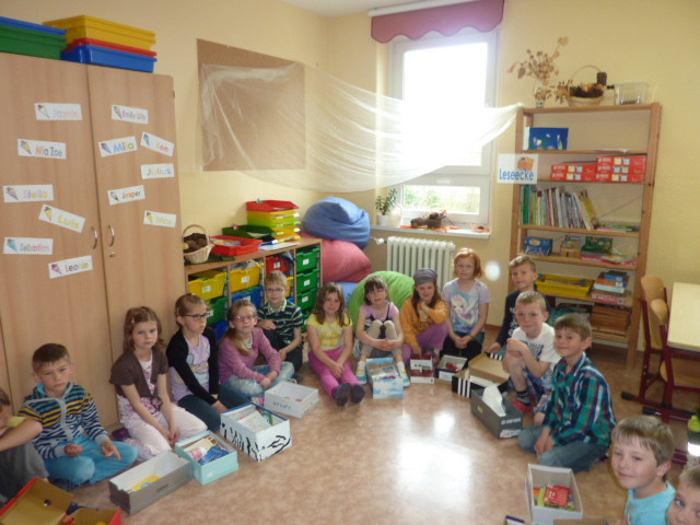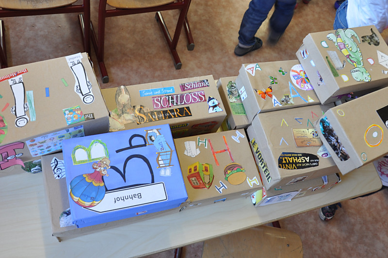 Wir haben mit unserer 1. Klasse für die zukünftigen Schulanfänger einen Schuhkarton zu jedem Buchstaben des Alphabets gefüllt. Hinein packten wir Dinge, die mit dem jeweiligen Buchstaben beginnen.