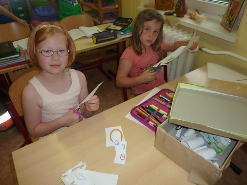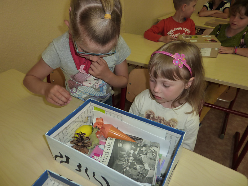 Wir sammelten mit unseren Eltern viele Gegenstände oder Bilder dazu. Endlich konnten wir diese Kartons mit in die Schule bringen. Wir haben sie dann gemeinsam beklebt und gestaltet. Die nächste 1. Klasse kann nun bei jedem neu erlerntem Buchstaben eine Schatzkiste öffnen.