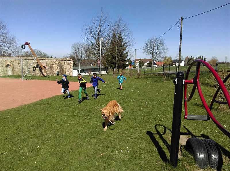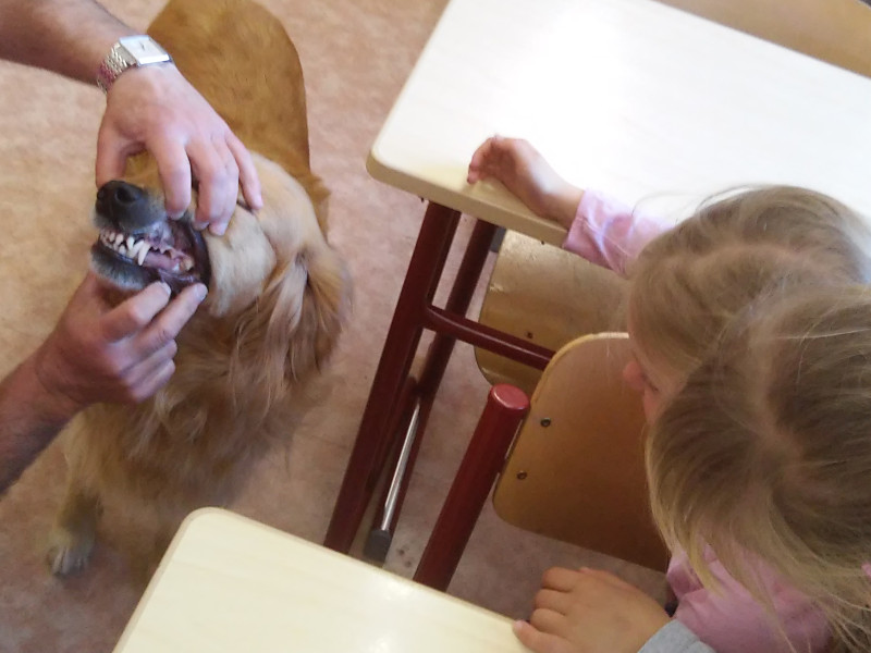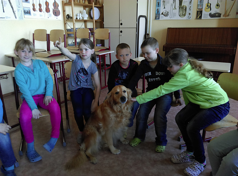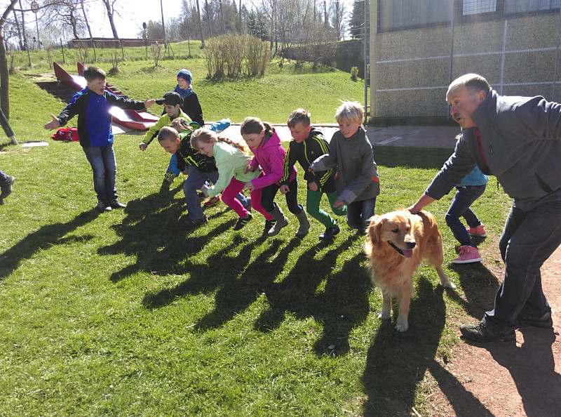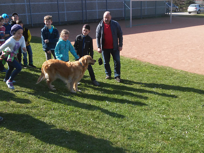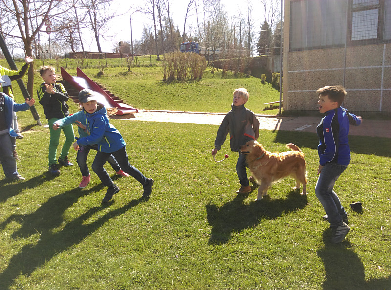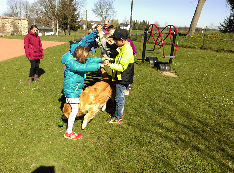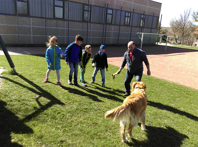 Die zweiten Klassen beschäftigen sich mit dem Thema Haustiere. Dabei lernen sie nicht nur Sachinformationen, sondern auch den richtigen Umgang mit Tieren. Im April 2015 luden wir in unseren Sachunterricht einen „echten“ Hund ein. Nelsy, eine Golden-Retriever-Hündin, besuchte uns zusammen mit ihrem Herrchen Uwe Schadel vom Verein „Helfer auf vier Pfoten“.