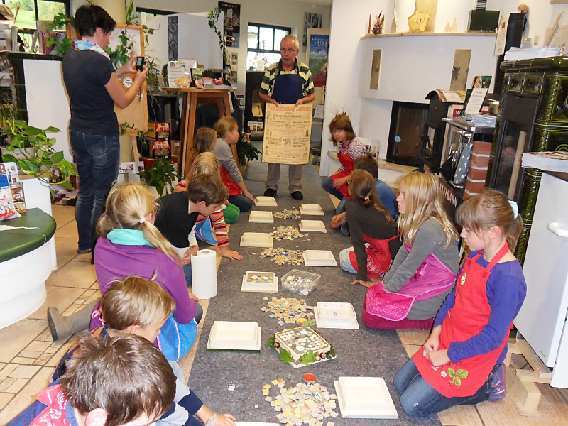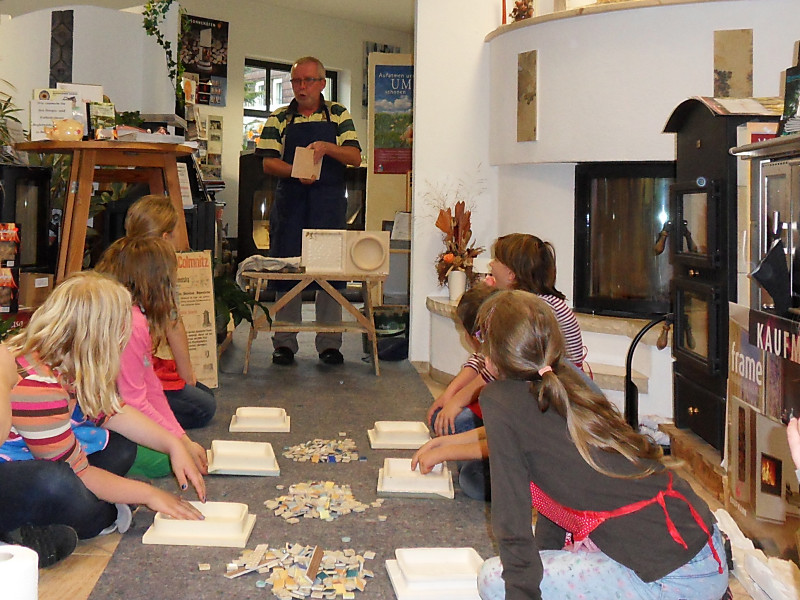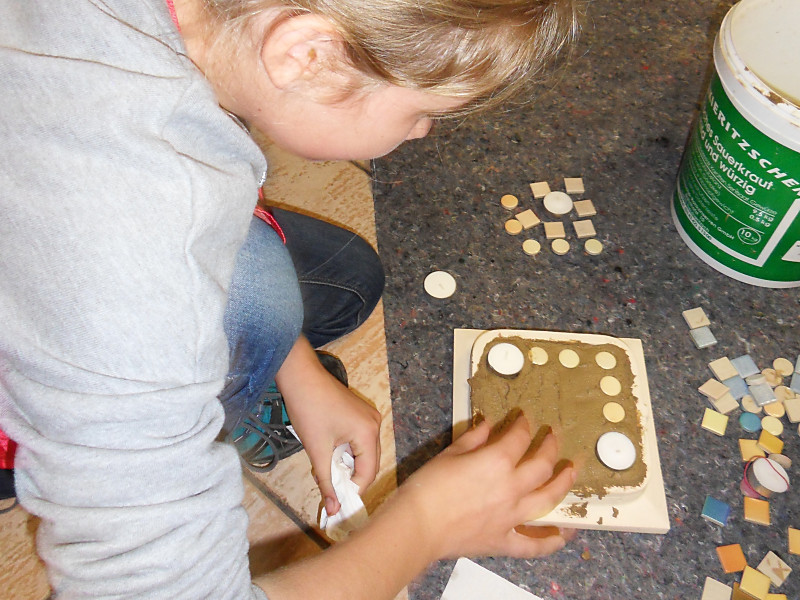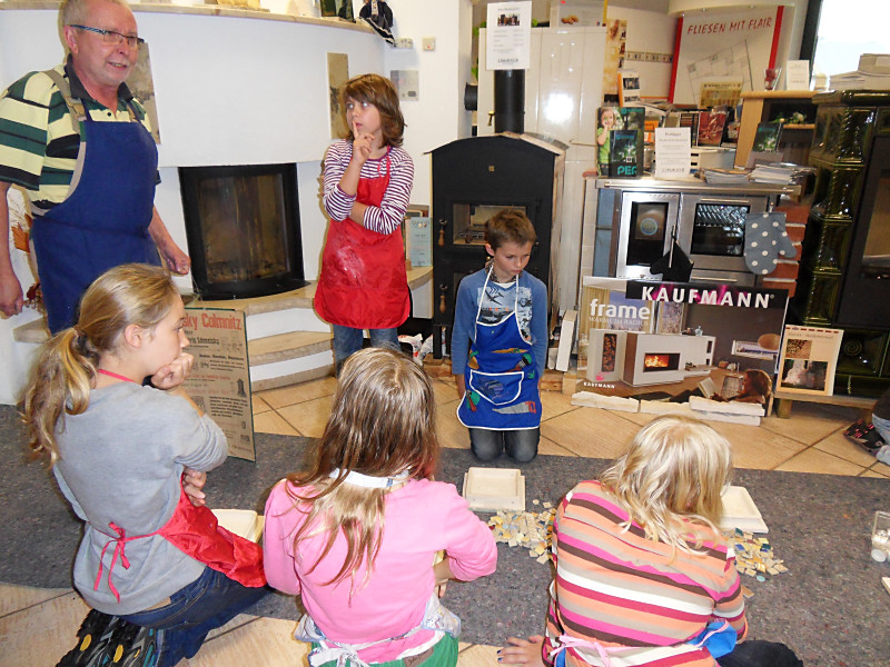 In alte Ofenkacheln durften wir ein eigenes Mosaik legen. |