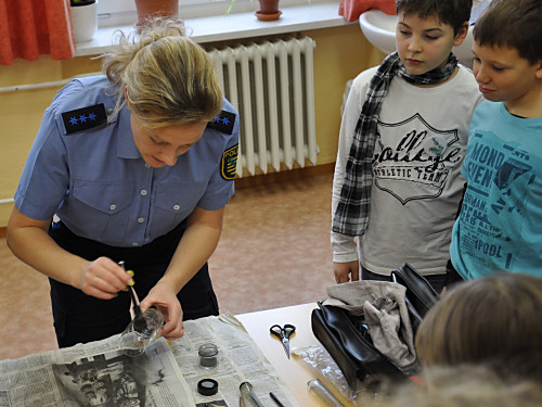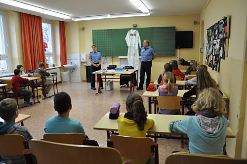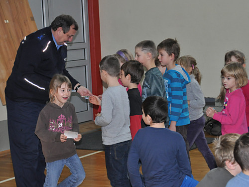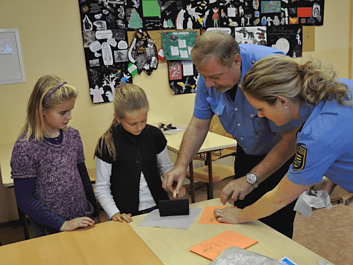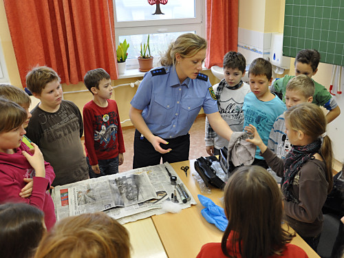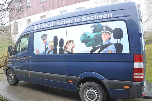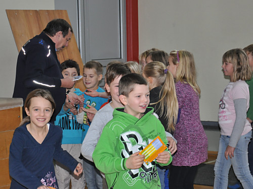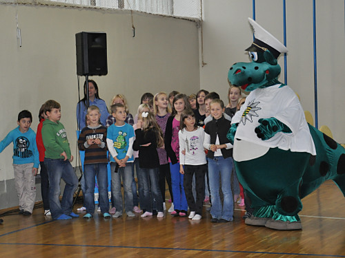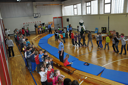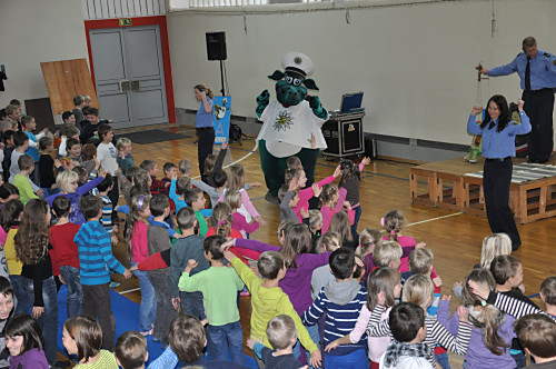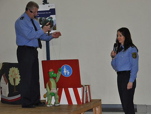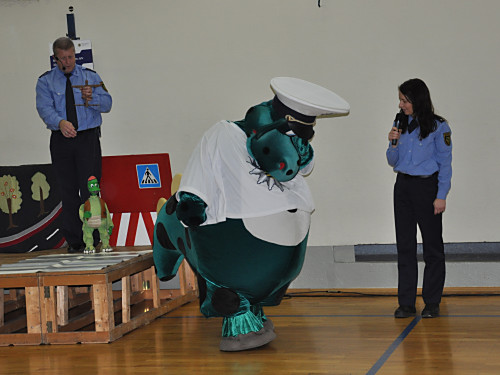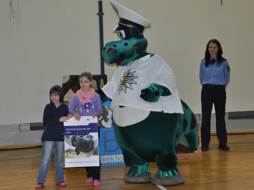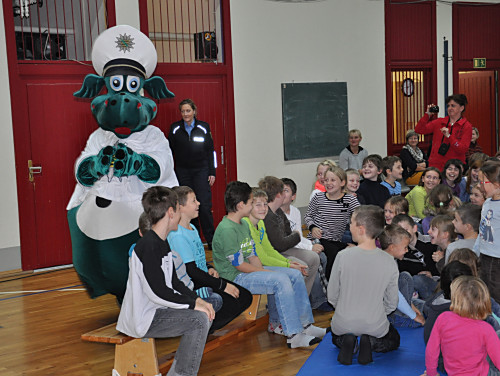 Am 22. November 2013 fand in unserer Grundschule ein Projekttag zum Thema „Verkehrserziehung” statt. Unter der Leitung von Herrn Kaminsky und der Organisation durch Herrn Binnewerg führte das Polizeirevier Dippoldiswalde, Abteilung Bürgerpolizisten und Prävention eine Veranstaltung durch: Alle Kinder der Klassen 1 bis 4 und die neuen Schulanfänger unserer drei Kindergärten erlebten ein Marionettentheater mit Billy, der den Kindern viele wichtige Verkehrszeichen lehrte. Das Beste war natürlich der Besuch von Poldi. Der Verkehrsdino ist der Liebling aller Kinder und ein Foto mit ihm war toll.