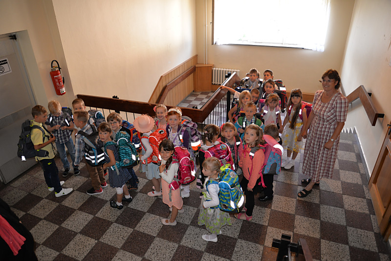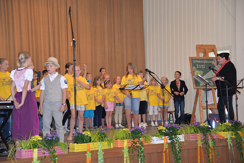Die Schulanfänger werden von der Schulleiterin, dem Bürgermeister, der Klassenlehrerin und den größeren Schülern beglückwünscht |