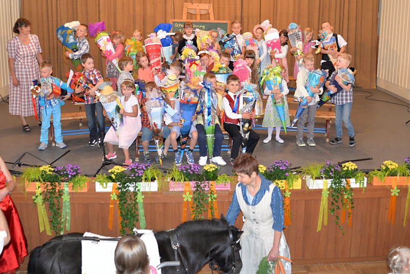 Das Pony hatte die Zuckertüten bis in den Saal gebracht, nun sollte es mit auf das Klassenfoto |