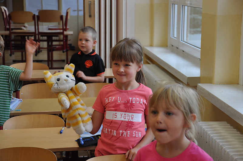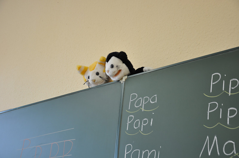 Manchmal beobachten die beiden Katzen vom Tafelrand aus die fleißigen Kinder im Klassenzimmer |