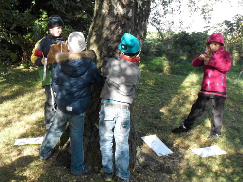 Auch die Klasse 2b nutzte einen sonnigen Herbstmorgen, um mit verschiedenen Messgeräten im Gepäck verschiedene Messübungen im Schulwald durchzuführen. Alle waren sehr gespannt, denn Mathematikunterricht im Wald gab es bisher noch nicht so oft. Viele Kinder hatten bereits auf dem Weg schon Ideen. Ganz eifrig durchstreiften sie dann das Gelände und nahmen die verschiedensten Baum- oder Pflanzenteile in Augenschein. Die Zeit verging wie im Fluge und jeder war stolz auf seine Ergebnisse.