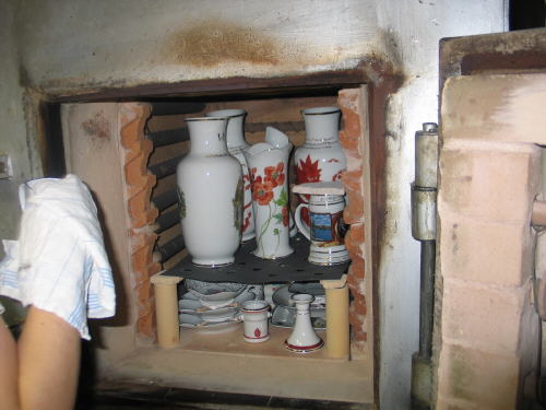 Dieser Muffelofen war schon beim Großvater im Einsatz. Nach Bedarf füllt Frau Göhler am Abend den Ofen, der eine Temperatur von 850 °C erreicht. Die Farbe muss drei Stunden lang bei dieser Temperatur gebrannt werden. Nach dem Abschalten kühlt der Ofen langsam ab und gegen 7 Uhr öffnet ihn die Meisterin. Frau Göhler ist jedes Mal gespannt und erwartet eine gelungene Arbeit.