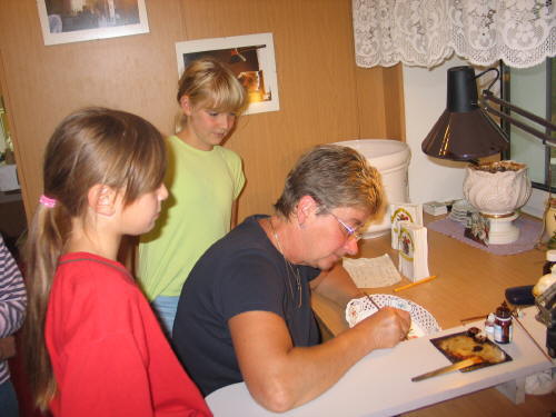 Frau Göhler zeigte uns die dazu notwendigen Tätigkeiten. Sie trägt die Farbe so auf, wie es schon