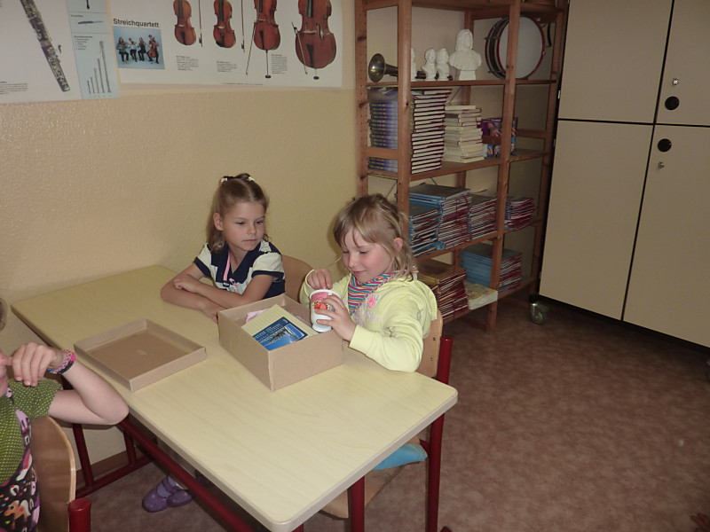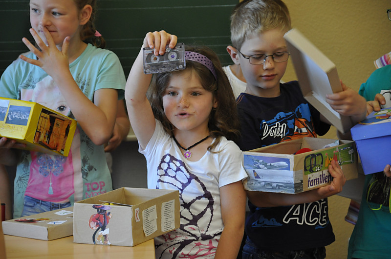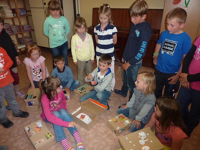 Wir sammelten mit unseren Eltern viele Gegenstände oder Bilder dazu. Endlich konnten wir diese Kartons mit in die Schule bringen. Wir haben sie dann gemeinsam beklebt und gestaltet. Die nächste 1. Klasse kann nun bei jedem neu erlerntem Buchstaben eine Schatzkiste öffnen.