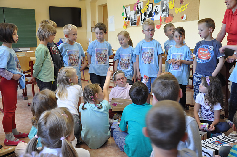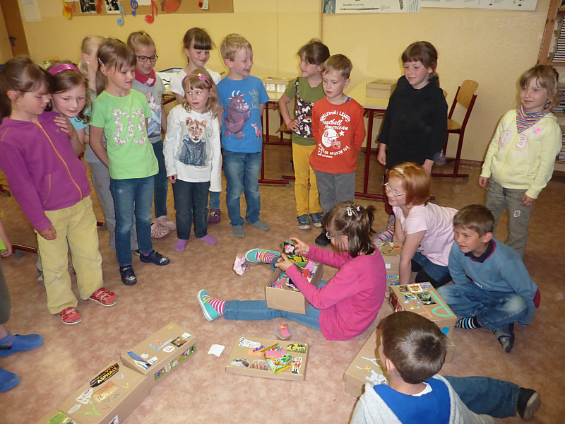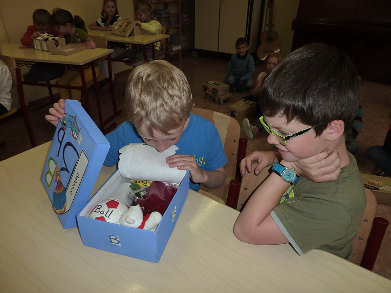 Wir haben mit unserer 1. Klasse für die zukünftigen Schulanfänger einen Schuhkarton zu jedem Buchstaben des Alphabets gefüllt. Hinein packten wir Dinge, die mit dem jeweiligen Buchstaben beginnen.