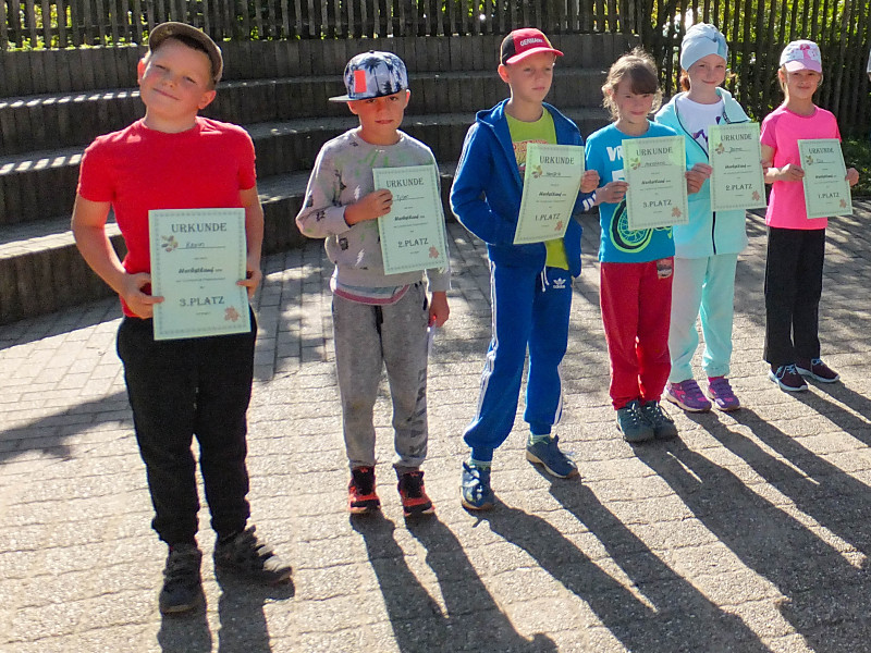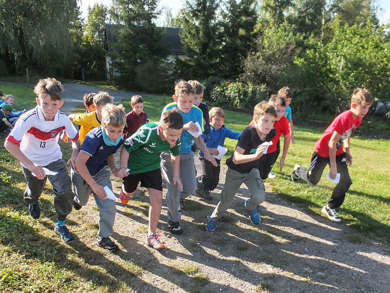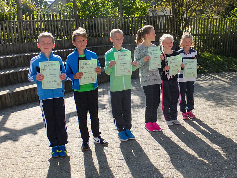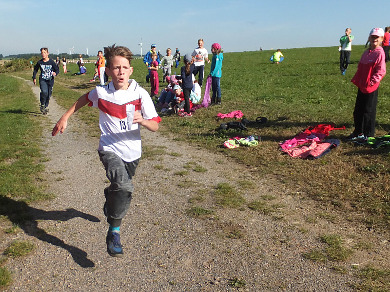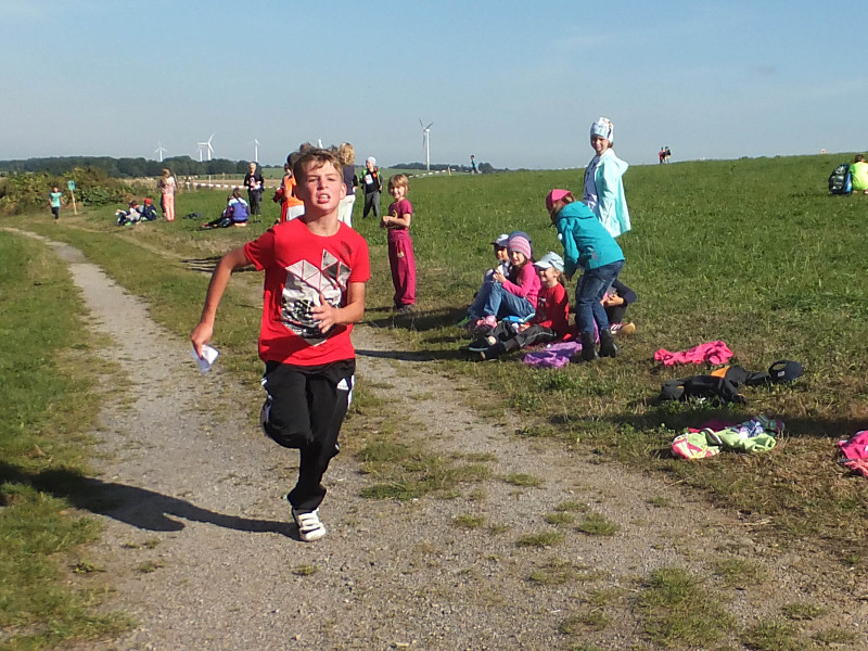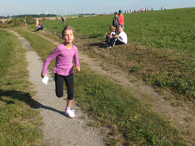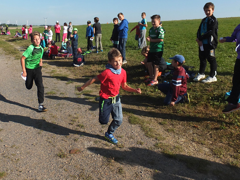 Bei herrlichem Wetter liefen die Schüler der 1. bis 4. Klasse mit ihren Laufzetteln die unterschiedlichen Stationen an. Mit Freude und Durchhaltevermögen schafften es alle, das Ziel zu erreichen. Dort wurden sie von ihren Mitschülern kräftig angefeuert. Zuschauer gab es diesmal auch am Feldrand und in der Luft.