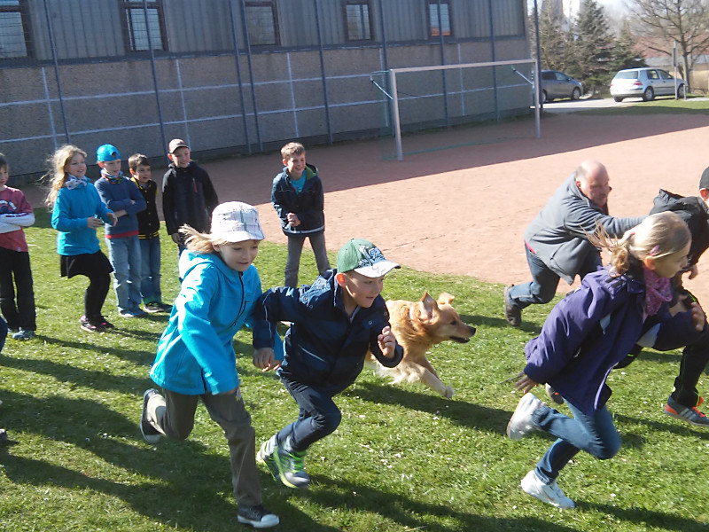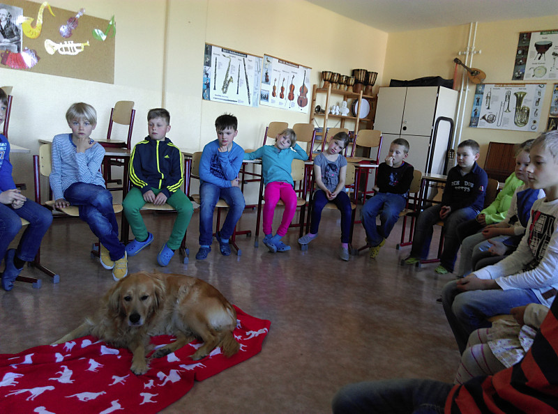 Die zweiten Klassen beschäftigen sich mit dem Thema Haustiere. Dabei lernen sie nicht nur Sachinformationen, sondern auch den richtigen Umgang mit Tieren. Im April 2015 luden wir in unseren Sachunterricht einen „echten“ Hund ein. Nelsy, eine Golden-Retriever-Hündin, besuchte uns zusammen mit ihrem Herrchen Uwe Schadel vom Verein „Helfer auf vier Pfoten“.