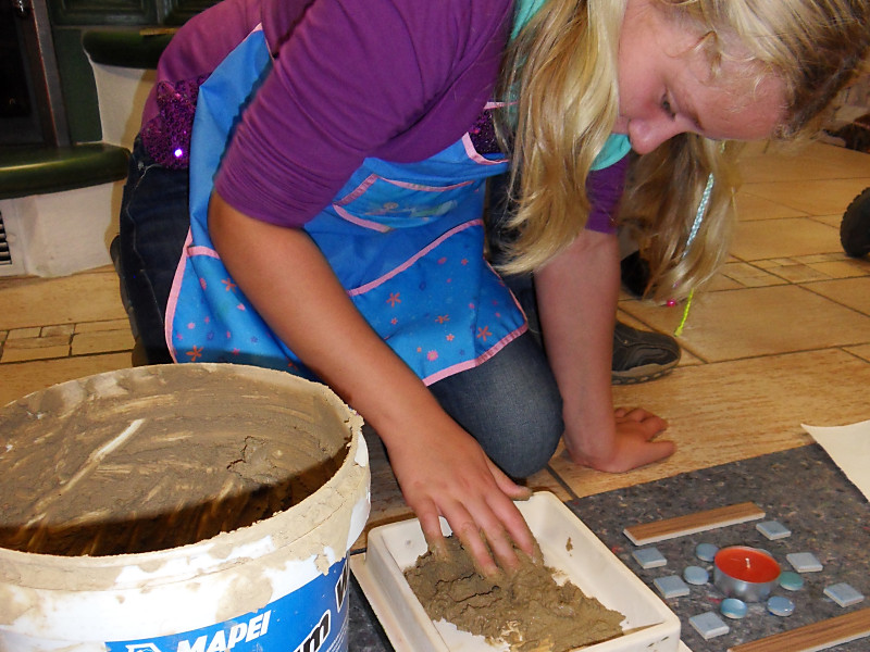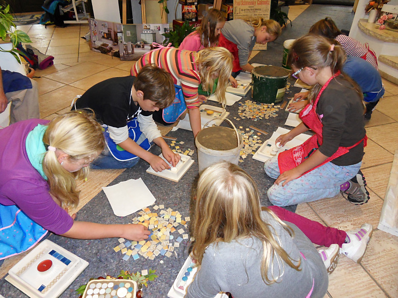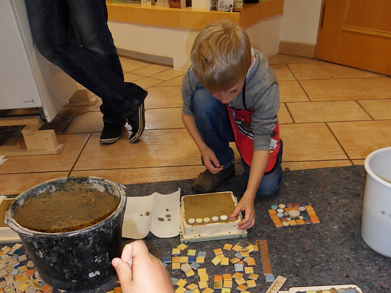 In alte Ofenkacheln durften wir ein eigenes Mosaik legen. |