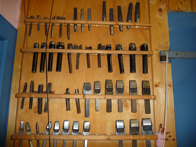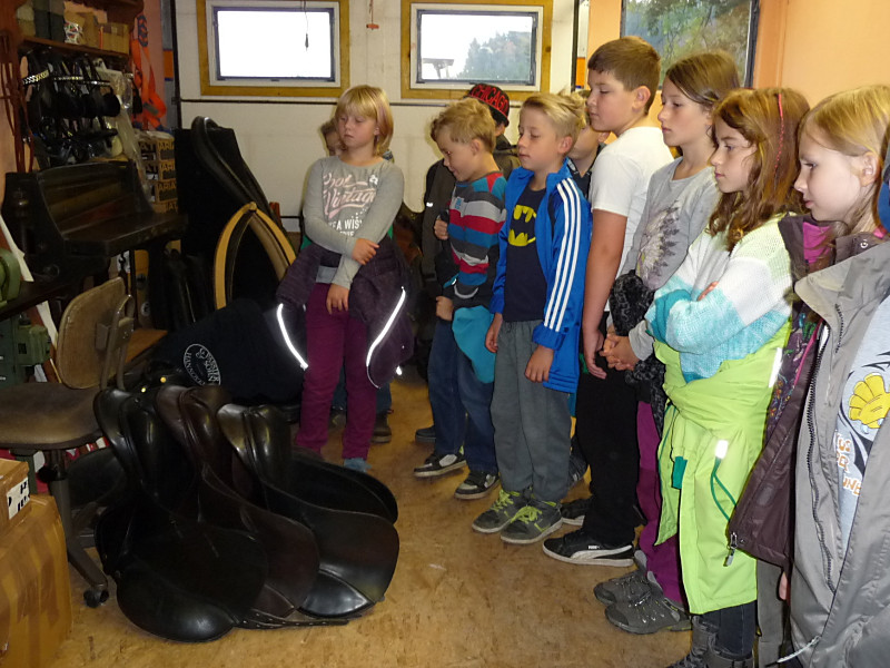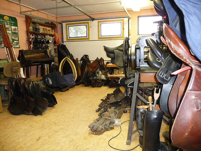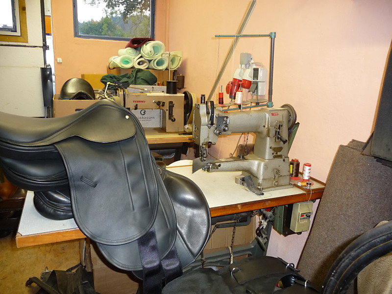 | Ein Werkstattraum mit Maschinen und gefertigten Sätteln. |