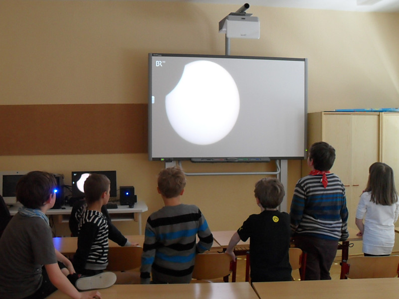 Die Schüler verfolgen die Sonnenfinsternis „augensicher“ im Livestream am interaktiven Whiteboard.