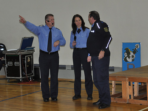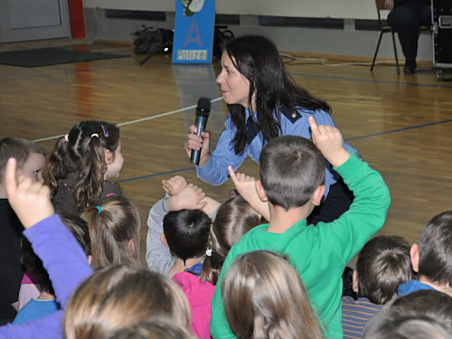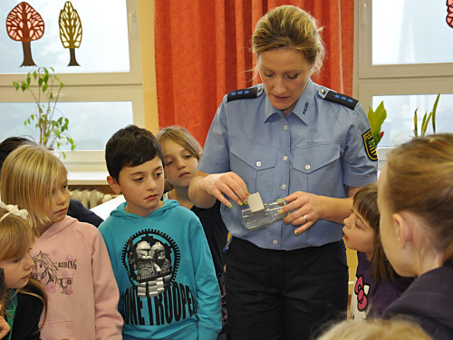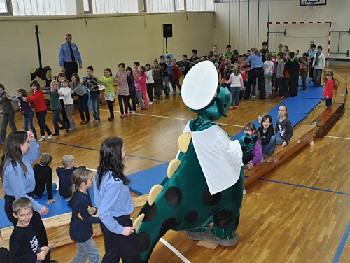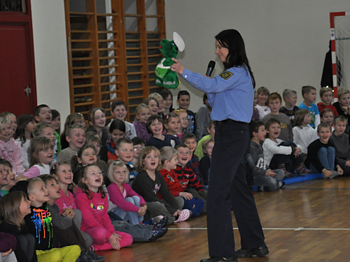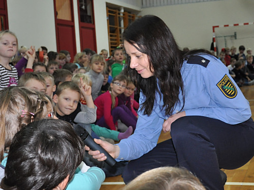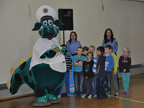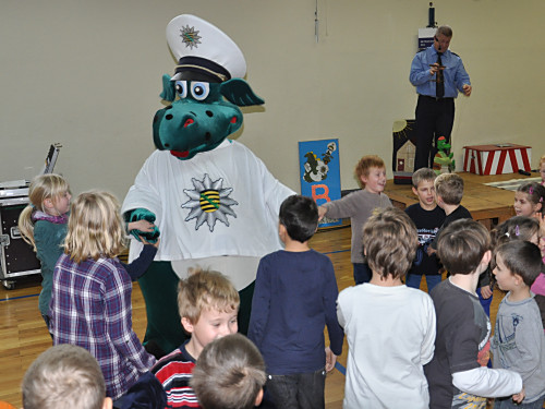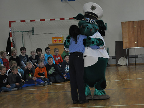 Am 22. November 2013 fand in unserer Grundschule ein Projekttag zum Thema „Verkehrserziehung” statt. Unter der Leitung von Herrn Kaminsky und der Organisation durch Herrn Binnewerg führte das Polizeirevier Dippoldiswalde, Abteilung Bürgerpolizisten und Prävention eine Veranstaltung durch: Alle Kinder der Klassen 1 bis 4 und die neuen Schulanfänger unserer drei Kindergärten erlebten ein Marionettentheater mit Billy, der den Kindern viele wichtige Verkehrszeichen lehrte. Das Beste war natürlich der Besuch von Poldi. Der Verkehrsdino ist der Liebling aller Kinder und ein Foto mit ihm war toll.