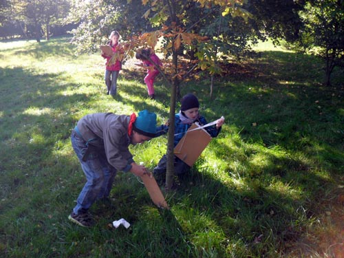 Auch die Klasse 2b nutzte einen sonnigen Herbstmorgen, um mit verschiedenen Messgeräten im Gepäck verschiedene Messübungen im Schulwald durchzuführen. Alle waren sehr gespannt, denn Mathematikunterricht im Wald gab es bisher noch nicht so oft. Viele Kinder hatten bereits auf dem Weg schon Ideen. Ganz eifrig durchstreiften sie dann das Gelände und nahmen die verschiedensten Baum- oder Pflanzenteile in Augenschein. Die Zeit verging wie im Fluge und jeder war stolz auf seine Ergebnisse.