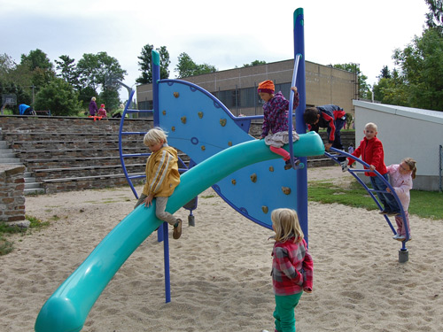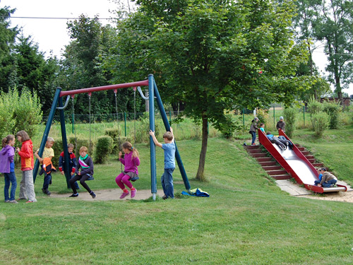 Spiel- und Bolzplatz für die sportlichen Betätigungen im Unterricht und in der Freizeit. Außer einem Fußball- und Basketballfeld gibt es unter anderem eine Seilbahn, einen Sandkasten mit Klettergerüst und Rutsche und natürlich eine Schaukel.
